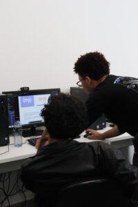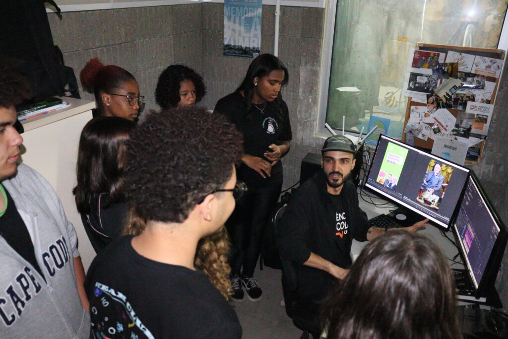 Da interação com os equipamentos à discussão sobre várias ideias para os vídeos, os alunos se viram ocupando o papel central da produção. Um momento de verdadeira liderança aconteceu ao longo da apresentação inicial do Núcleo de Design, quando o estudante Julio Francisco da Silva Lopes pediu licença para explorar o material do CPQ no computador e aproveitou para deixar um feedback positivo sobre a estética criada pelos bolsistas.