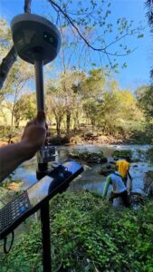 Após a coleta, os dados passam por processamento em softwares especializados. “O princípio do processamento é corrigir as coordenadas que pegamos em campo para obter a posição ideal”, explica Ellyon Magri Martins. Algumas posições podem ser ajustadas em tempo real, enquanto outras passam por pós-processamento para alcançar maior precisão. Esse trabalho resulta em mapas, plantas e relatórios técnicos, assinados por engenheiros responsáveis, garantindo validade jurídica perante o Incra. Pedro descreve essa etapa como decisiva: “O projeto de planejamento que usamos no campo é atualizado com as coordenadas obtidas. Assim garantimos que cada divisa esteja registrada com precisão”. O uso de drones também tem sido incorporado, agilizando o levantamento e aumentando a segurança da equipe em áreas de difícil acesso. “Antes, tínhamos que atravessar rios e matas fechadas, enfrentando riscos como pedras escorregadias e até cobras. Ainda fazemos isso, mas com os drones, conseguimos extrair alguns dos dados necessários de forma mais segura e rápida”, complementa Ellyon.